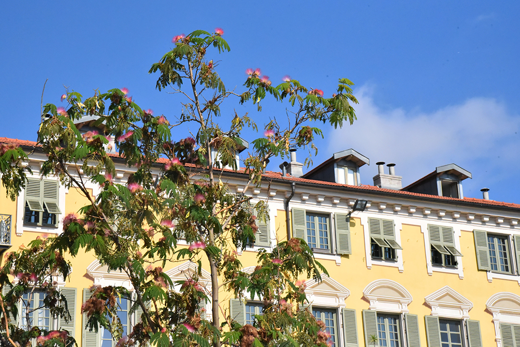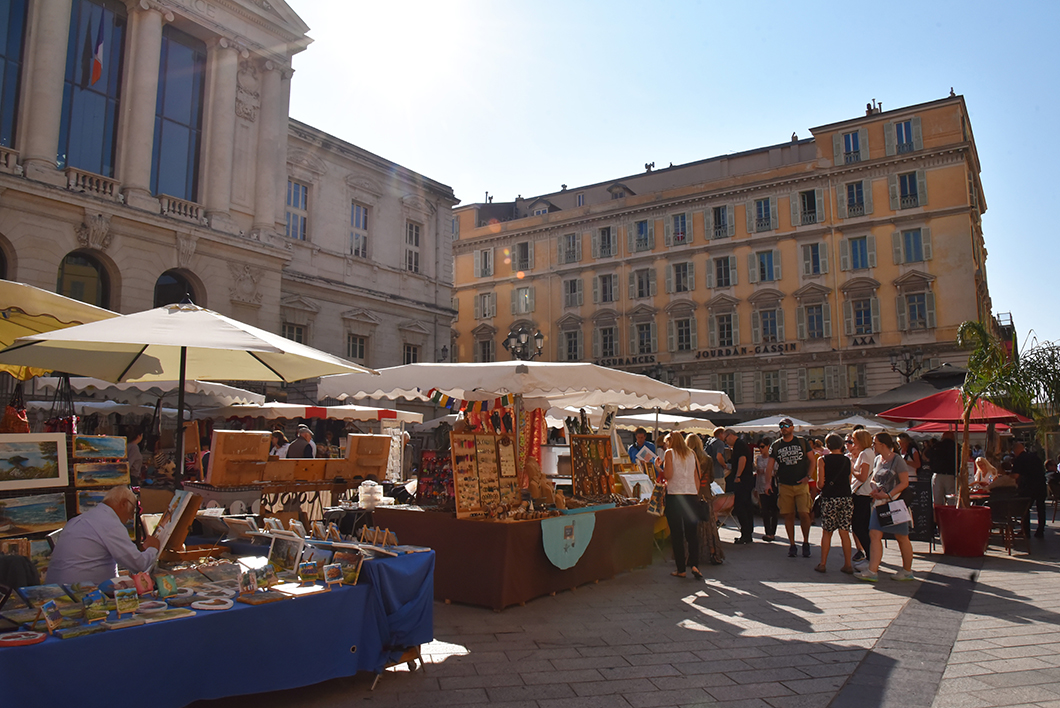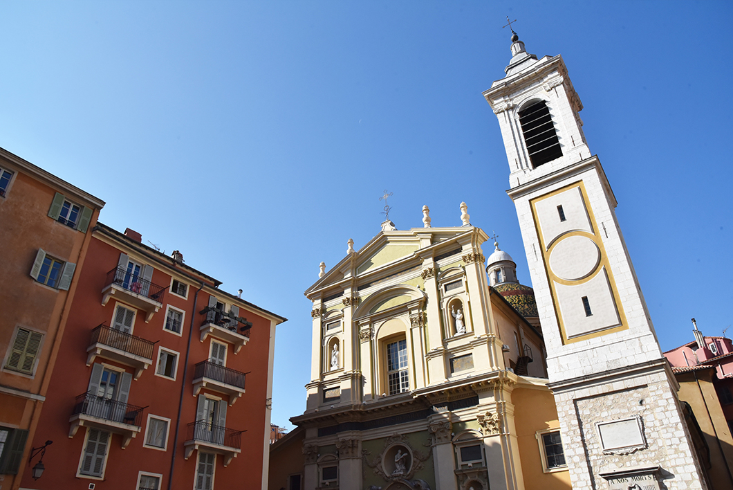 La lace Pierre Gautier, le palais de la préfecture, le palais de justice, le marché du Cours Saleya, la place Rossetti, la Cathédrale Sainte Réparate ainsi que la place Saint François